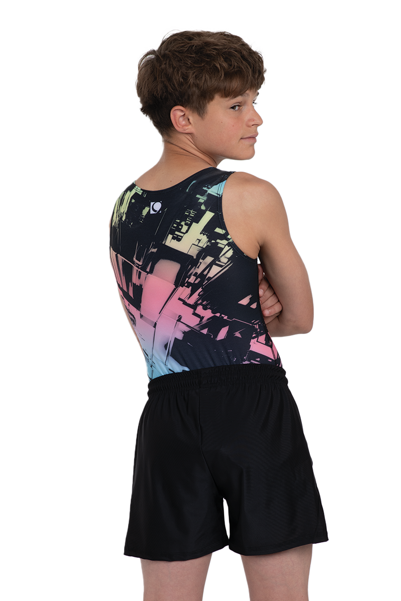 Edge Pastel redefines men’s gymnastics leotard design with a bold yet effortlessly wearable style. Crafted from premium sublimated lycra, it pairs a sleek black base with vibrant mint, yellow, and copper coral—capturing the rhythm and vibrancy of the city that never sleeps. An abstract skyline pattern sweeps across the body, blending architectural lines with a contemporary artistic twist.