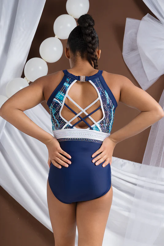 Featuring a high racer-style neckline with clasp closure and a teardrop open back, Oceania offers a contemporary, striking silhouette. Standard and AB stones accent the bodice, adding subtle sparkle that enhances the intricate design without overpowering it. Perfect for gymnasts seeking a chic, modern, and stylish leotard, Oceania moves with confidence, fluidity, and effortless grace.