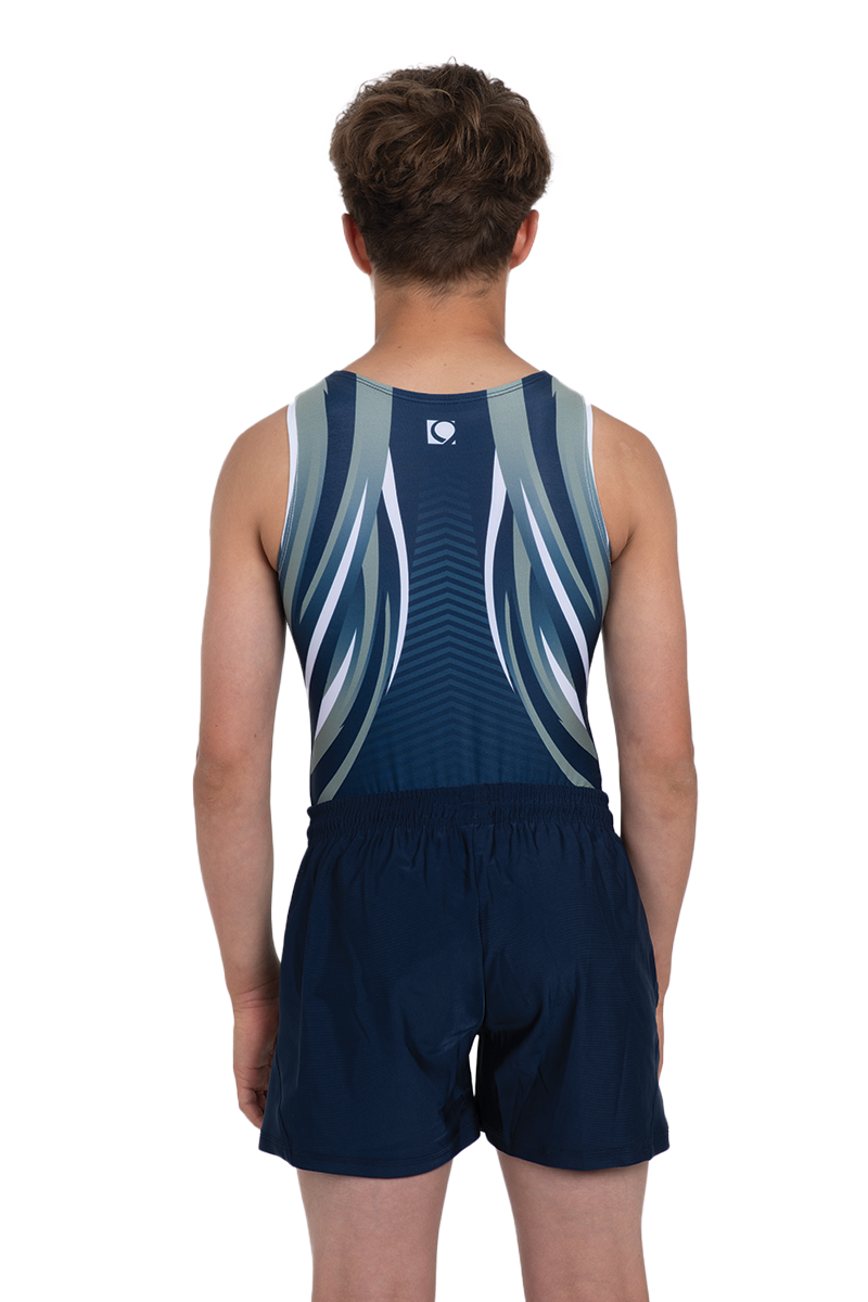 Renegade is built for athletes who want sleek style with sport-ready performance. Crafted from premium sublimated lycra, this men’s gymnastics leotard features a deep navy base highlighted by sweeping khaki and white curved lines from the shoulders—creating a strong, dynamic silhouette.