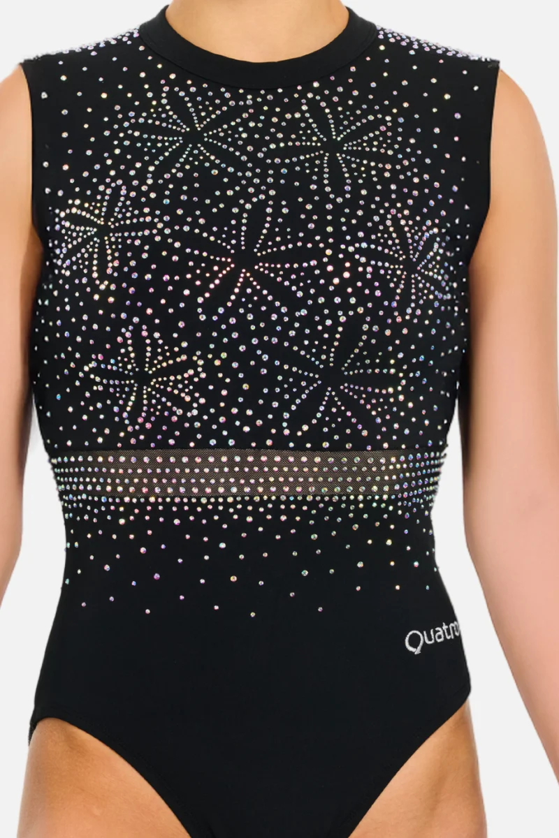 The Saffron leotard, created for the INSEP team to wear at the French National Championships, embodies a sleek and sophisticated style. Crafted with a black lycra body and finished with a high neckline featuring matching lycra binding and a clasp closure, it delivers a clean, structured silhouette. A circular cut-out adds a contemporary, fashion-forward touch, while a black mesh panel at the waist—embellished with shimmering stones— forms a striking belt detail that lends refined sparkle. The leotard’s centerpiece is a breathtaking burst of floral design, formed by a radiant arrangement of standard and AB stones. These stones fan out from the neckline across the bodice, creating an intricate pattern that glimmers brilliantly from every angle, ensuring the gymnast captivates the light with every movement. With its dazzling embellishments, the Saffron leotard is designed to command attention and make a bold statement on the competition floor.